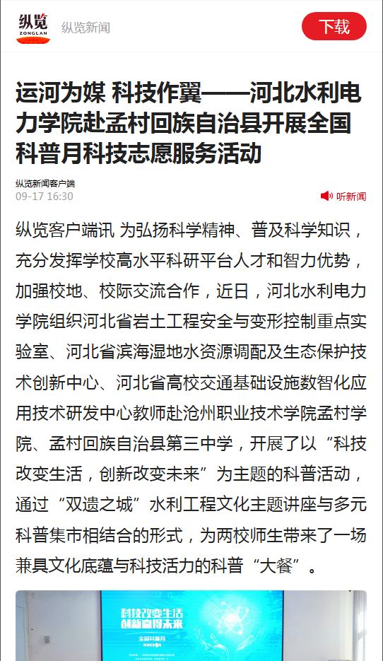 河北新闻网报道我校开展科普活动,受到广泛关注。为弘扬科学精神、普及科学知识,充分发挥学校高水平科研平台的人才与智力优势,近日,我校组织河北省岩土九游(中国)公司安全与变形控制重点实验室、河北省滨海湿地水资源调配及生态保护技术创新中心、河北省高校交通基础设施数智化应用技术研发中心的教师,赴沧州职业技术学院孟村学院及孟村回族自治县第三中学,成功举办了以“科技改变生活,创新改变未来”为主题的科普活动。活动通过“双遗之城”水利九游(中国)公司文化主题讲座与多元科普集市相结合的形式,为两校师生带来了一场内容丰富、形式生动的科普盛宴。此次活动正值孟村回族自治县建县70周年,不仅普及了科学知识,也有效激发了青少年的科学兴趣与文化自信。今后我校将继续发挥自身优势,深化校地合作,为服务地方经济社会发展贡献高校力量。